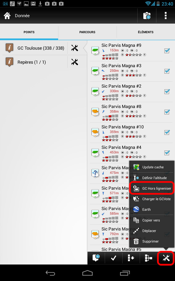 Sur l’écran de gestion des points et itinéraires (ce n’est pas obligatoirement des geocaches, vous pouvez enregistrer aussi d’autres points d’intérêts), sélectionnez la catégorie et les caches pour lesquelles vous souhaitez télécharger les images. Cliquez ensuite dans le bandeau inférieur sur la dernière icône de Configuration. Plusieurs options s’affichent alors, sélectionnez GC Hors Ligneniser.