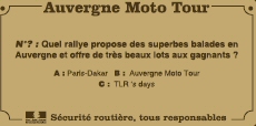 Auvergne Moto Tour est une chasse au trésor sur le thème de la moto, organisée sur les 4 départements de l’Auvergne, du 1er mai au 15 août 2010.