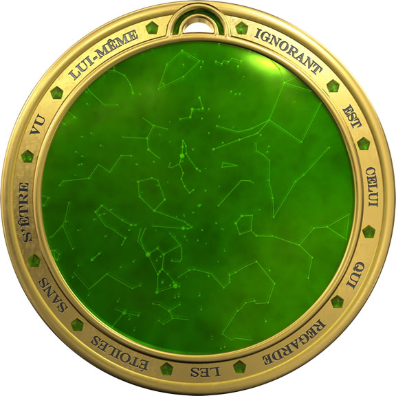 : un bijou innovant, de haute joaillerie, en or, incrusté d’émeraudes, d’une valeur de 100 000 €. Le médaillon, qui sera visible en réalité augmentée dans le livre de la chasse au trésor, présentera des innovations techniques qui auront un rôle à jouer…