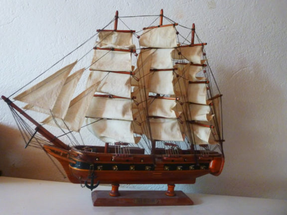 Ce coffret contient mes coordonnées personnelles permettant de me contacter. Celui ou celle qui l’aura retrouvé me ramènera en mains propres le coffret, en même temps que la résolution de la dernière énigme. Je lui remettrai en échange une magnifique maquette en bois d’un trois-mâts baptisé « TOUR DU GLOBE » (dimensions : Longueur totale : 50 cm. Largeur 43 cm socle compris) comportant 26 canons au total (13 à tribord et 13 à bâbord). Une belle maquette que vous pourrez exposer chez vous à l’entrée de votre demeure ou dans le salon (voir photo).