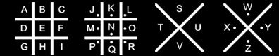 Comme vous pourrez le découvrir dans l’excellent livre de Didier Müller, Les codes secrets décryptés, l’Alphabet des Templiers (voir également sur ce site au sujet de l’Ordre du Temple) peut être considéré comme une variante (ou en tout cas très proche) du chiffre Pig Pen.